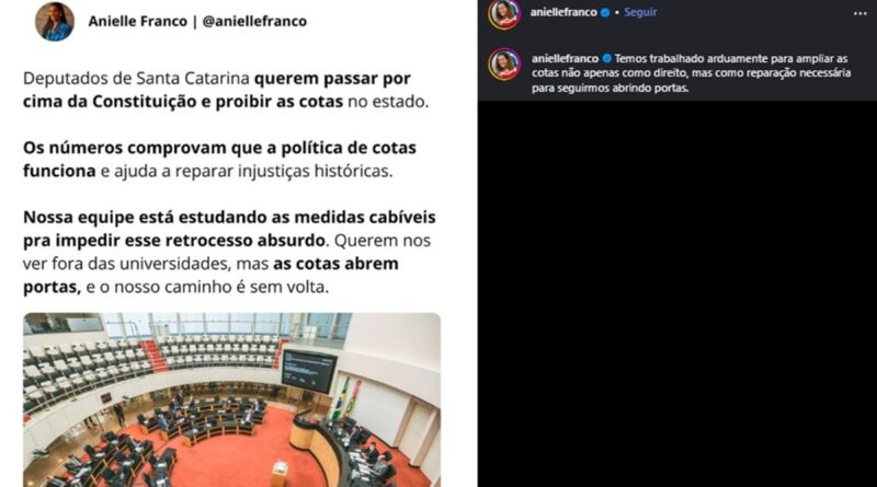 Read MoreAnielle Franco diz que Governo Federal estuda medidas contra lei que acaba com cotas raciais em universidades de SC 📅