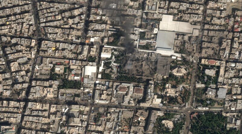 Imagem de satélite mostra fumaça preta subindo e grandes danos no complexo do Líder Supremo do Irã, o Aiatolá Ali Khamenei, após ataque — Foto: Pleiades Neo (c) Airbus DS 2026/Divulgação via REUTERS