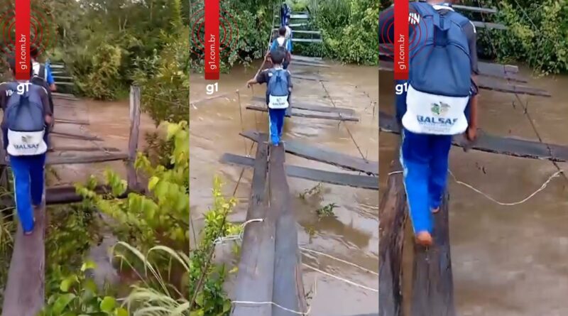 Imagens feitas por moradores mostram estudantes caminhando sobre tábuas deterioradas, parte do que restou da antiga ponte (veja acima). Para atravessar, os alunos se apoiam em uma corda. A correnteza do rio é forte e os estudantes fazem a travessia descalços. Segundo os moradores, a madeira está escorregadia e frágil.