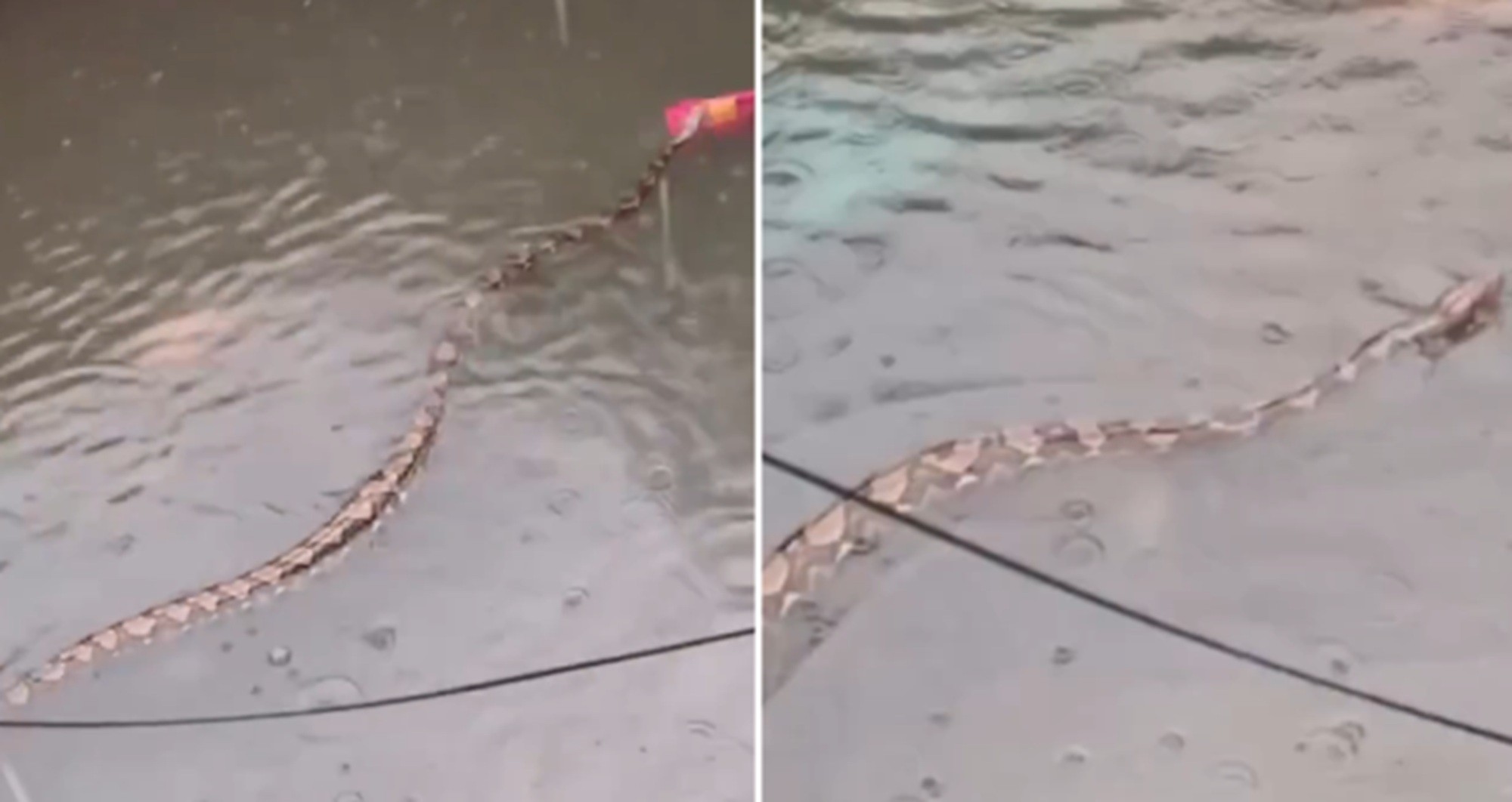 • No registro, uma cobra gigante aparece nadando em uma rua residencial completamente alagada. Da varanda de uma casa, o homem que filma a cena começa a gritar, em indonésio: “A Píton é enorme! Não entre na nossa casa. É uma cobra enorme. Cuidado, cuidado, cobra grande!”.