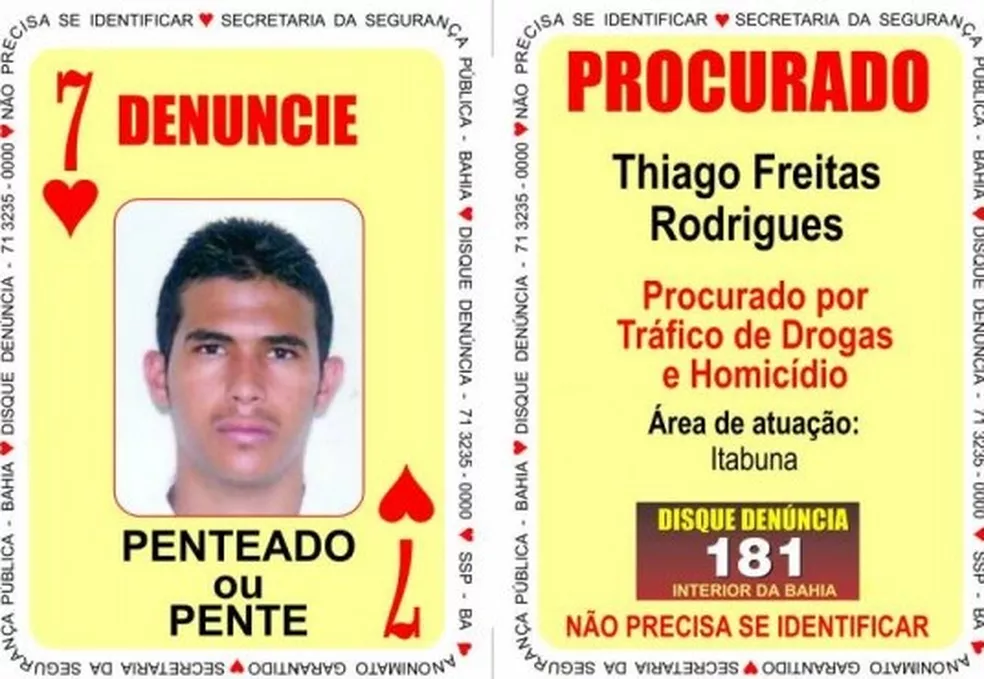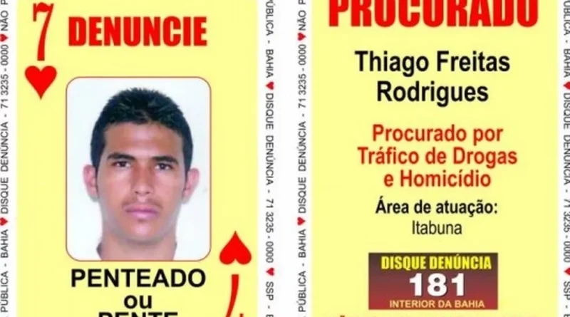 De acordo com informações da Secretaria da Segurança Pública da Bahia (SSP-BA), o suspeito, identificado como Thiago de Freitas Rodrigues, que é conhecido como “Penteado”, é o 7 de Copas do “Baralho do Crime”.