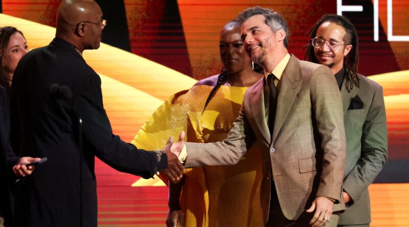 Delroy Lindo cumprimeta Wagner Moura no palco, após anunciar o prêmio de melhor filme internacional para “O Agente Secreto” durante cerimônia do Spirit Awards. — Foto: Mario Anzuoni/Reuters