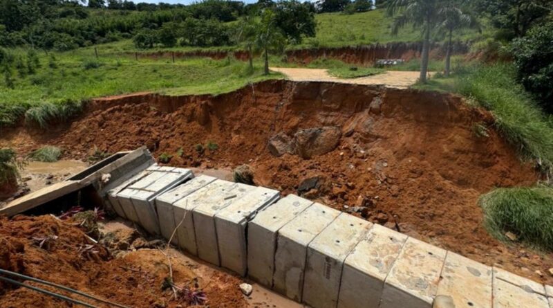 A ponte foi levada pela enxurrada e uma cratera se abriu na zona rural de Ubá — Foto: Supash/Reprodução
